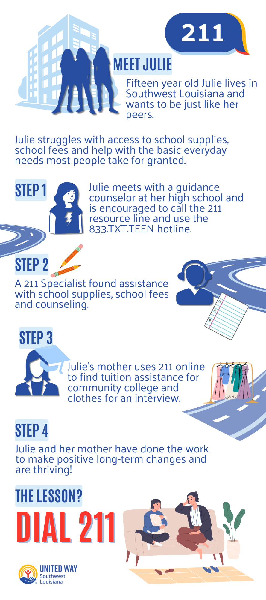 211 calls are answered by trained information and referral specialists that find resources in your specific geographic area.