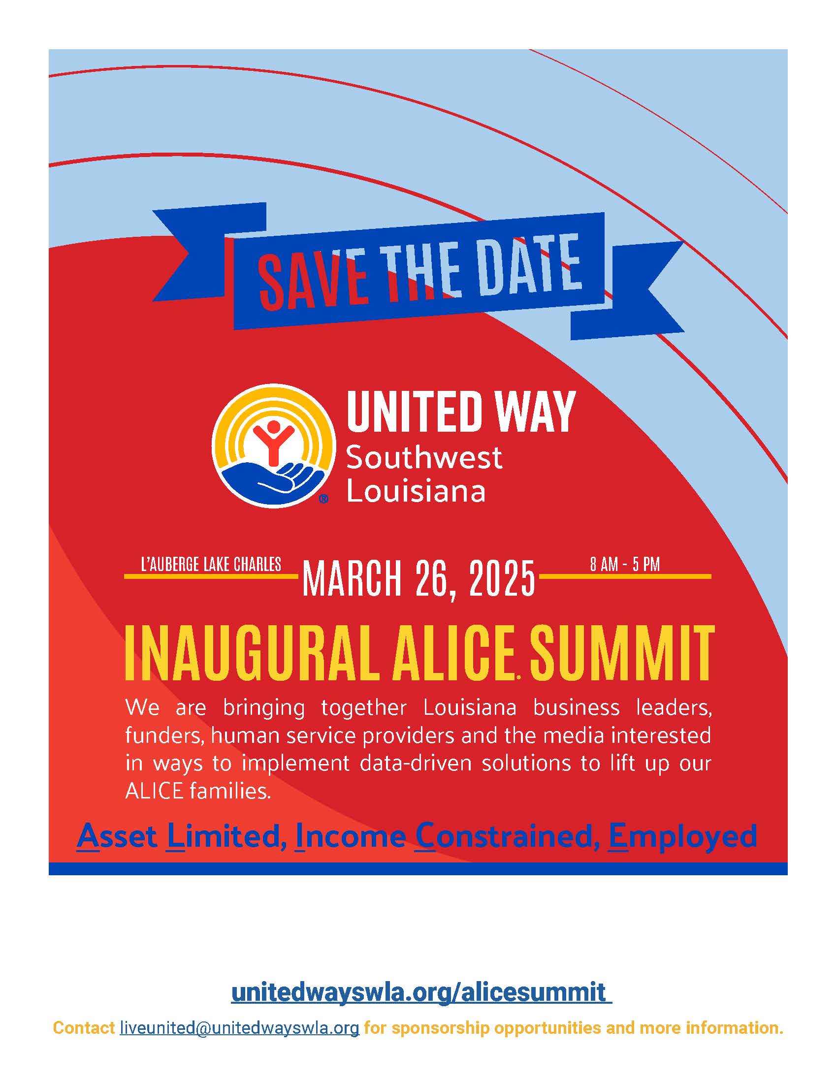 For more information about the ALICE Summit and sponsorship opportunities, or to register, please visit unitedwayswla.org/alicesummit