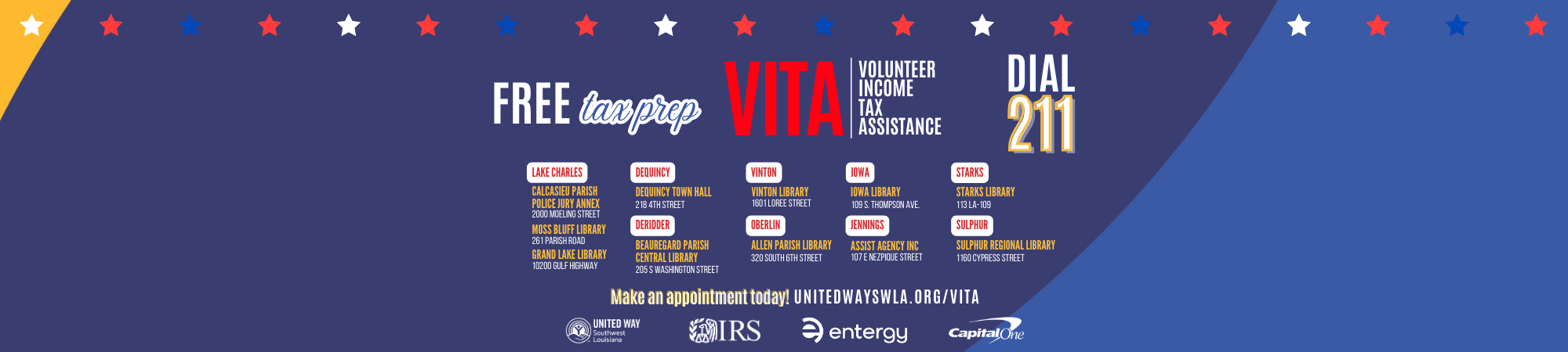 Clients can call 211 to schedule an in-person appointment. We have nine available VITA sites across the five-parish Southwest Louisiana region, with current location details accessible online at unitedwayswla.org/vita or by calling 211.